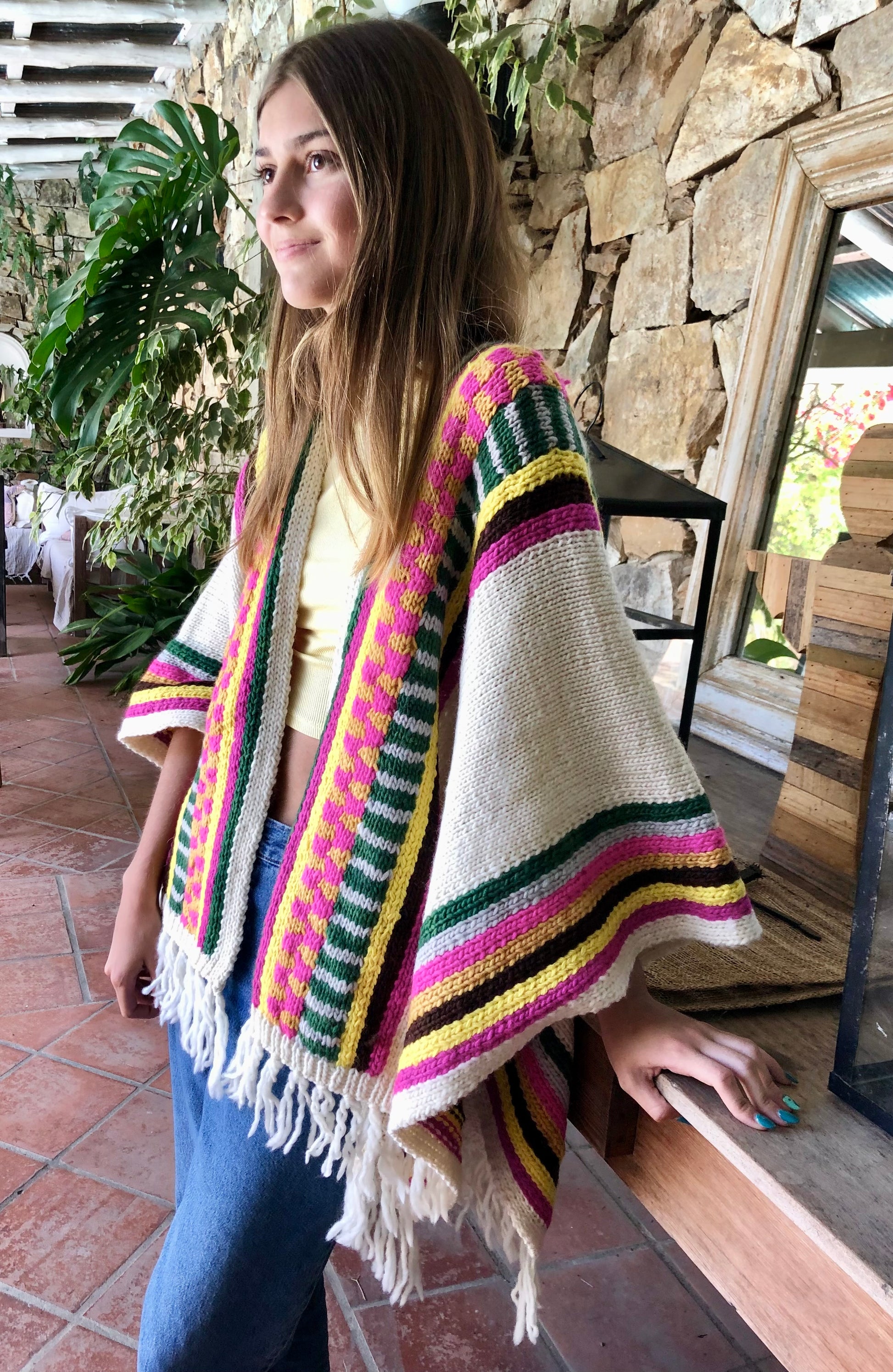 Cada pieza lateral del Chal Oliva presenta dibujos geométricos en jacquard, con alternancia de colores y rayas que se extienden hasta por debajo de la línea de los hombros. Con un juego de rayas de colores alternados en los extremos y flecos en color crudo que añaden movimiento a la prenda.