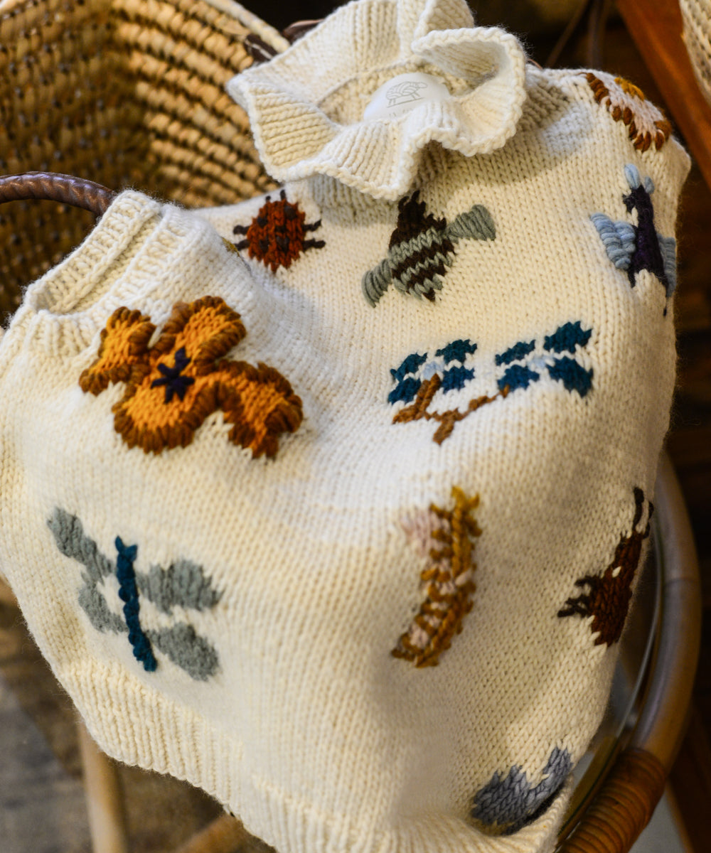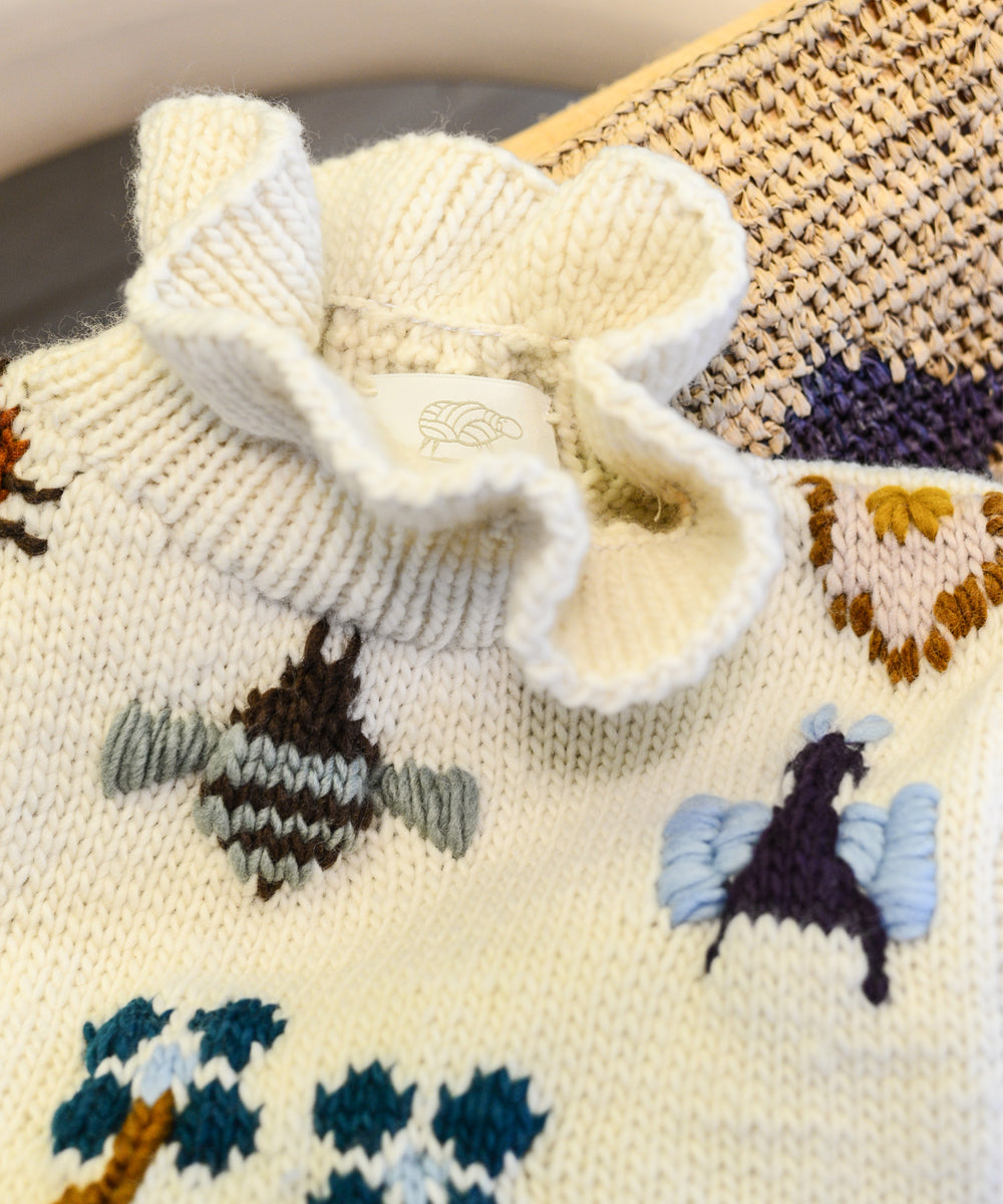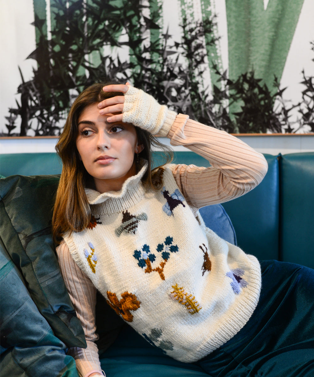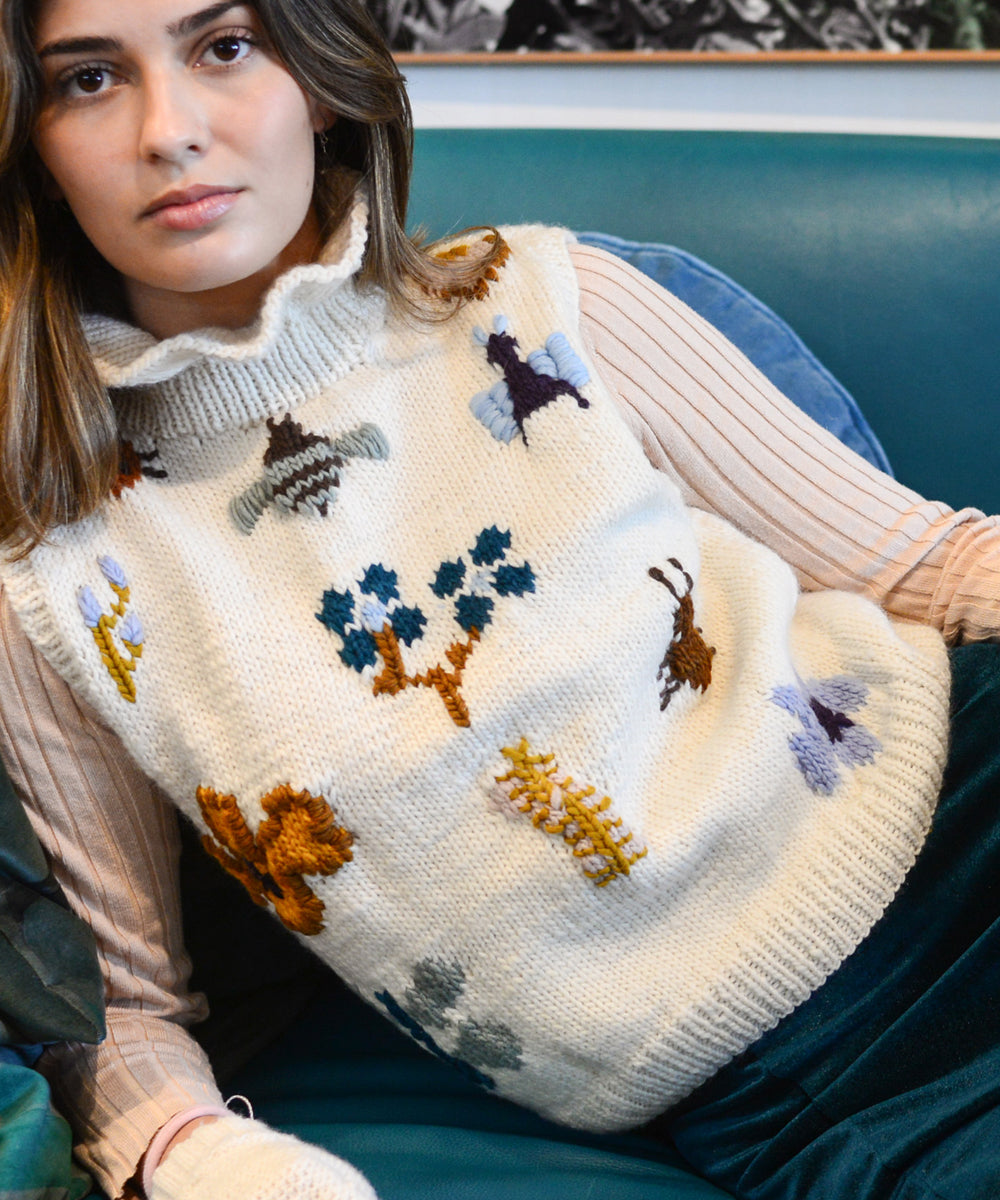 El Chaleco Bichos se caracteriza por su importante cuello gorguera, de silueta relajada y cómoda sisa. En la superficie delantera se presentan delicados elementos bordados a mano inspirados en la naturaleza.