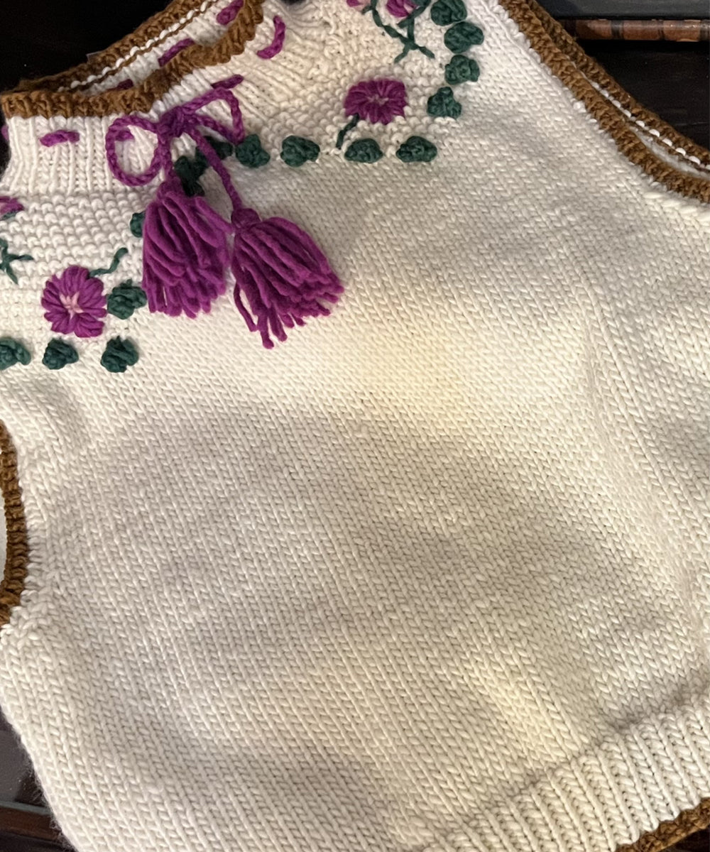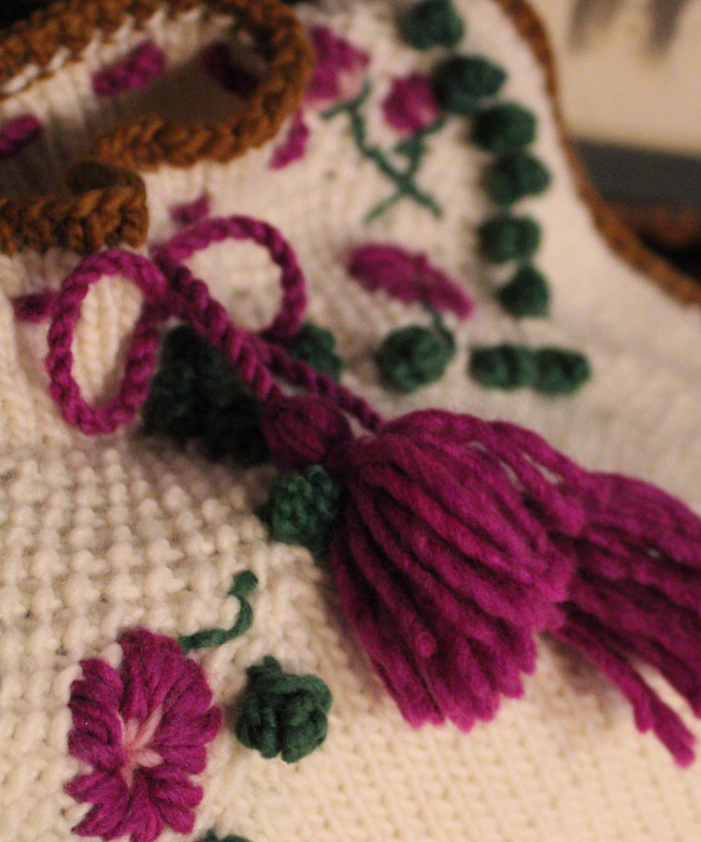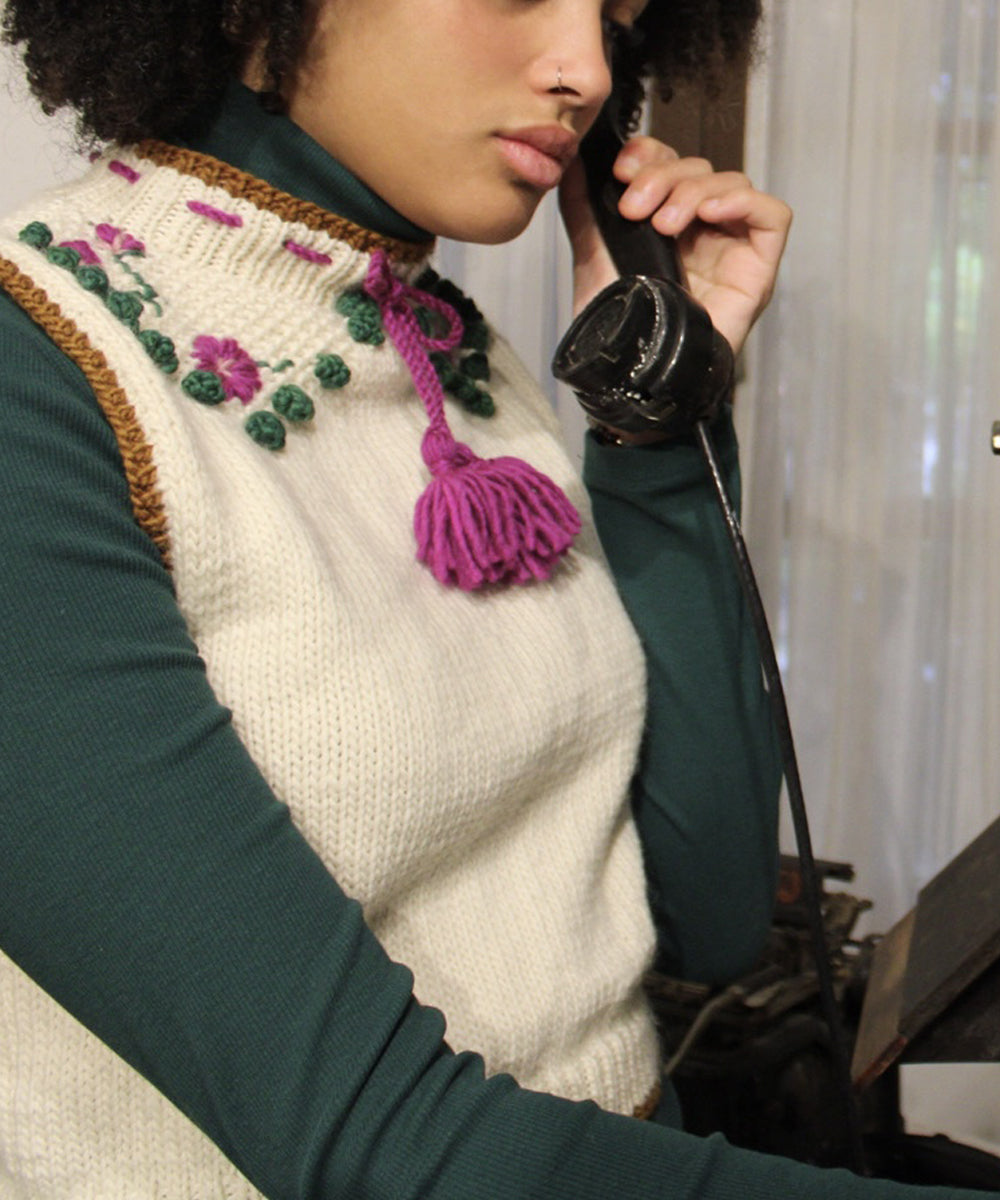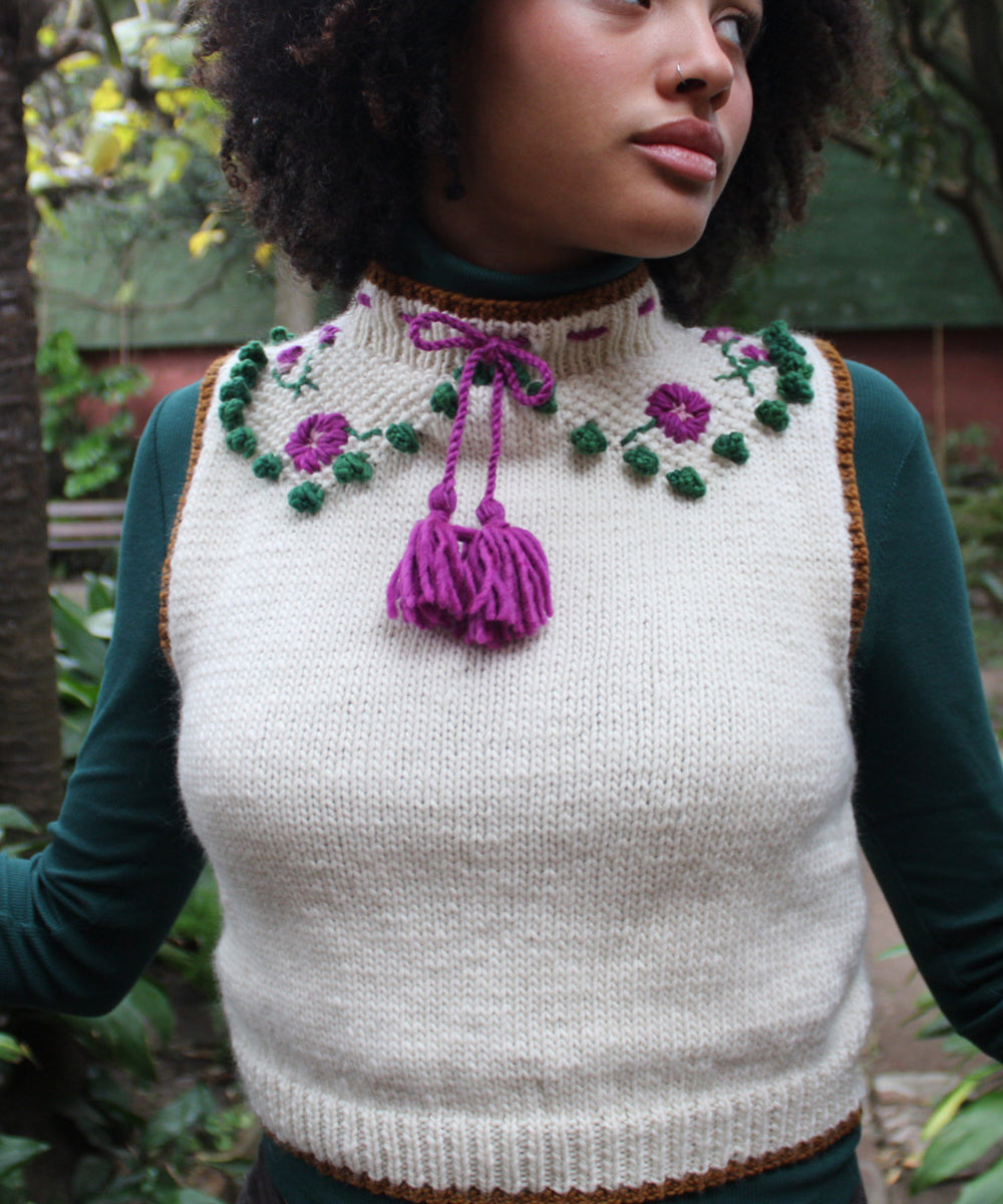 El Chaleco Bonet está inspirado en las siluetas de las prendas ajustadas de los años 50. Su pechera en punto arroz con detalles en punto bodoque crea un contraste con el color crudo de la lana natural, añadiendo un toque de sofisticación. Medio cuello ajustable con cordón en color magenta y flores bordadas a mano aporta un toque de delicadeza y feminidad al diseño.