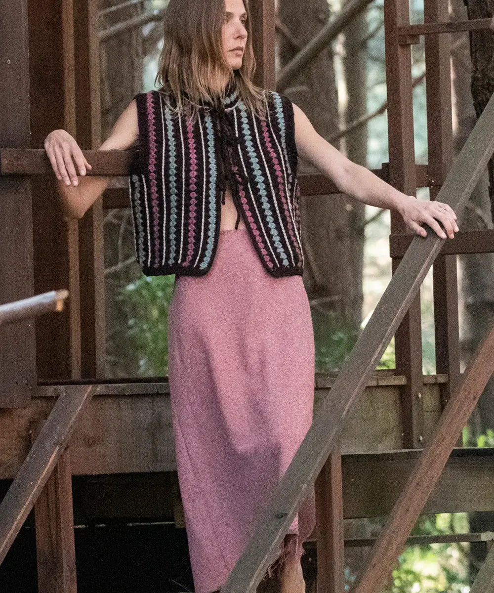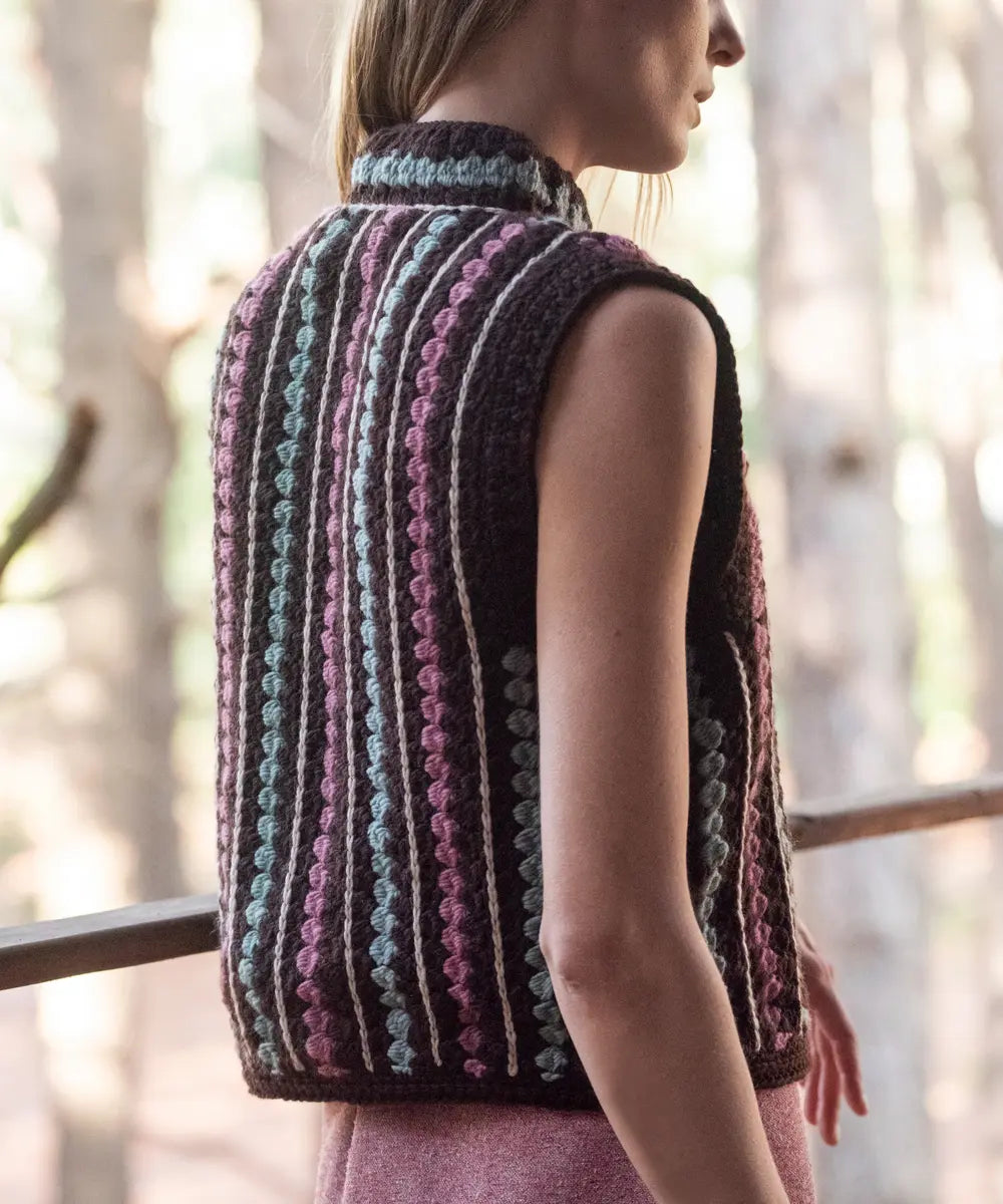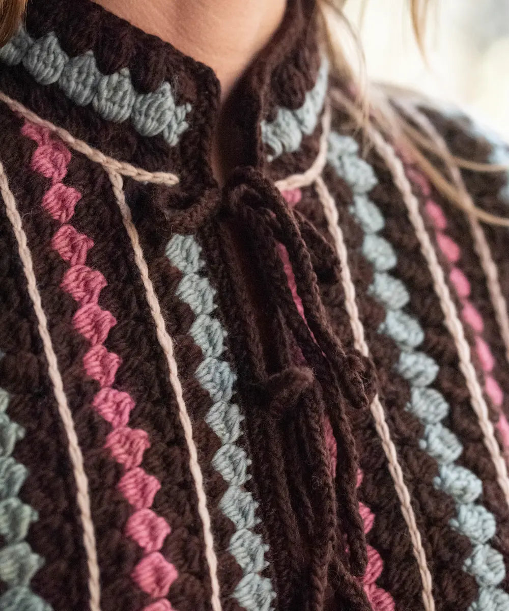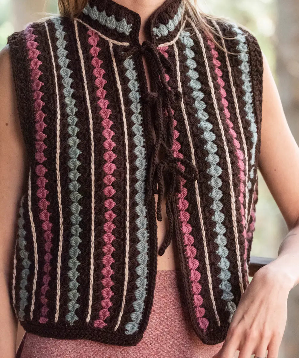 El Chaleco Verdi es tejido en crochet y combina el abrigo de la lana con una estructura aireada. Con cuello mao y delicados lazos en la parte delantera para un cómodo y coqueto cierre.