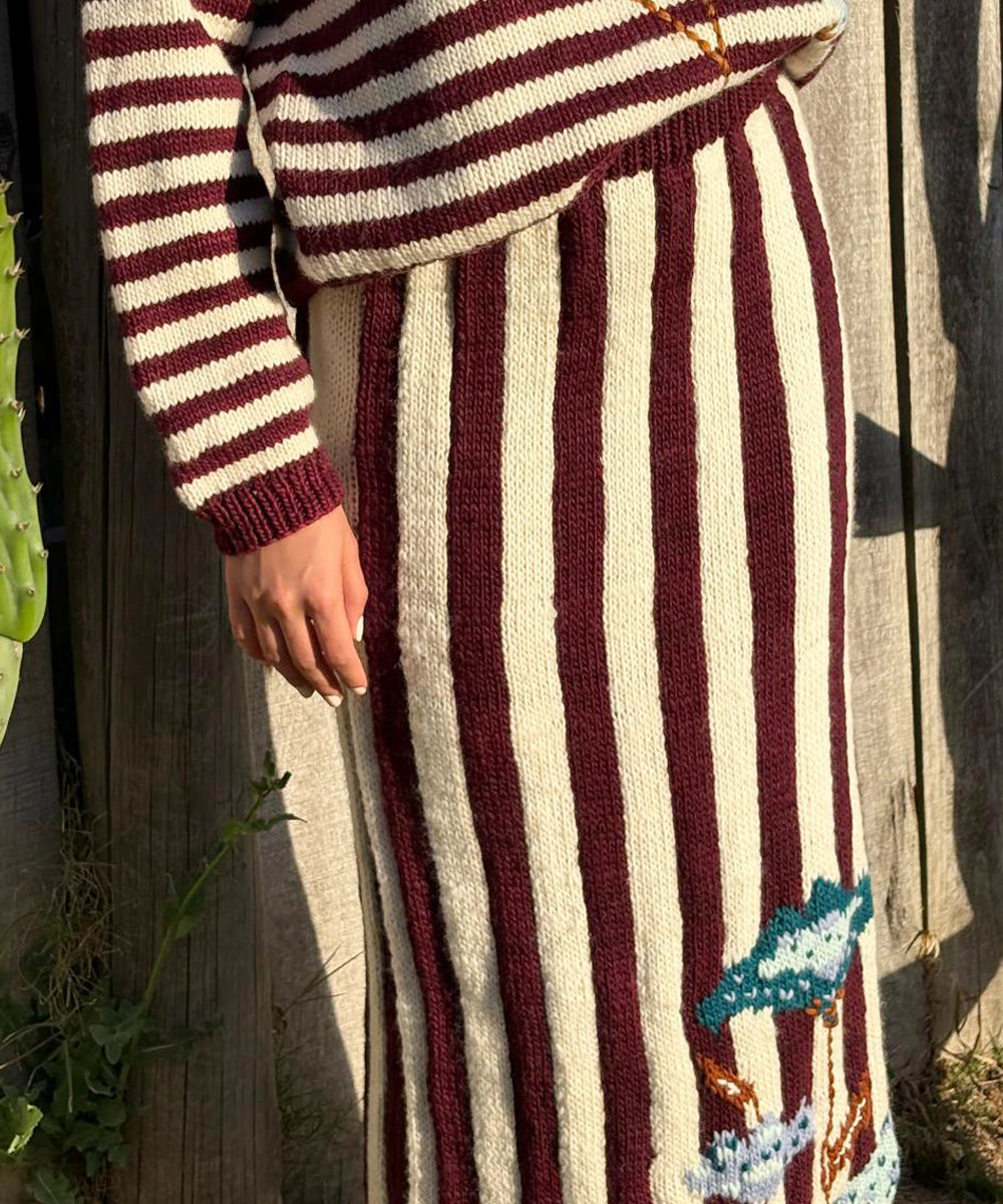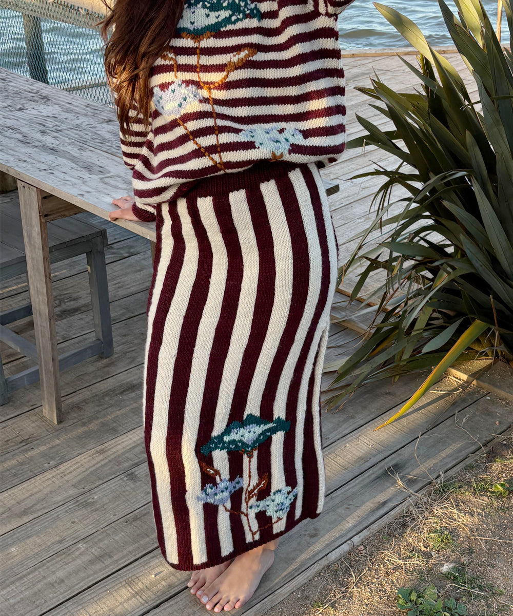 La Falda Hortensia es tejida a mano, suave al tacto y con una caída cómoda que acompaña el movimiento. Su diseño de rayas verticales en color bordeaux y crudo estiliza la silueta, se destaca el detalle de una gran flor bordada a mano en colores que contrastan con el fondo de la falda. Se ajusta a la cintura con una cómoda banda elástica que garantiza un ajuste personalizado.