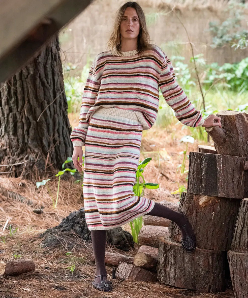 Cálida y femenina falda midi tejida a mano en lana merino.