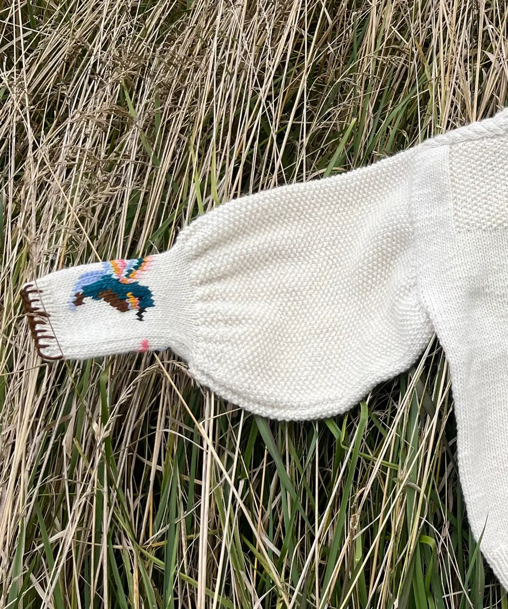 El Sweater Heaven es tejido en jersey y con un bloque de punto arroz en la parte superior delantera, detalle de trenza en los hombros. Importantes mangas globo con un ancho y cómodo puño con boradado a mano y pespunte a contratono.