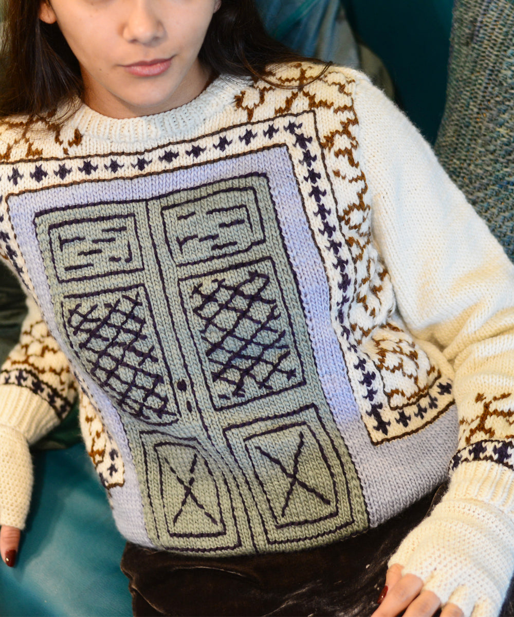 Cálido sweater que presenta patrones geométricos hecho a mano en 100% lana merino.